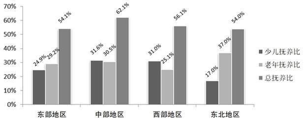 综上,从人口总量、年龄结构和教育素质三个维度看,东部地区具有明显的人口总量势能优势,人口抚养负担相对较轻,教育素质居于领先地位;中部地区人口总量势能较弱,人口抚养负担相对较重,教育素质居中;西部地区人口总量势能较弱,人口抚养负担居中,教育素质相对落后但在加快追赶;东北地区人口总量势能很弱,人口抚养负担相对较轻但老年抚养负担很重,教育素质虽仍居前列但未来堪忧。
