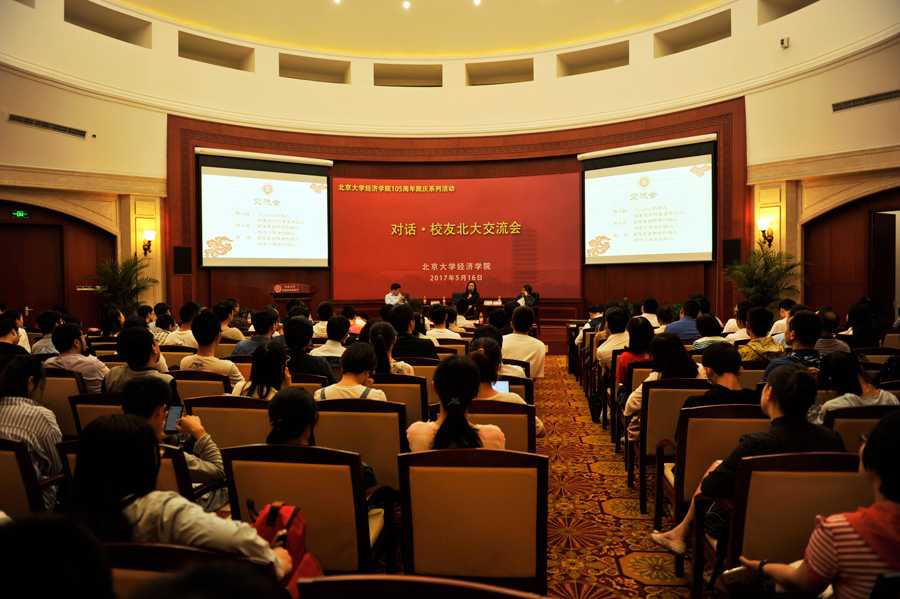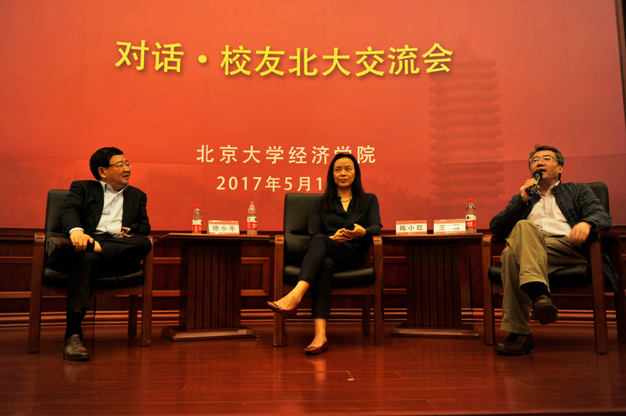 5月16日晚,威尼斯wnsr9778105周年院庆系列活动之“对话·校友北大交流会”在学院东旭学术报告厅举行。出席交流会的嘉宾是3位北大校友:H Capital创始人、前老虎基金全球合伙人陈小红、真格基金联合创始人、新东方联合创始人徐小平、真格基金联合创始人、新东方联合创始人王强,300余名师生、北大校友以及社会各界人士到场聆听。交流会由威尼斯wnsr97782015级金融硕士范雯琪主持。